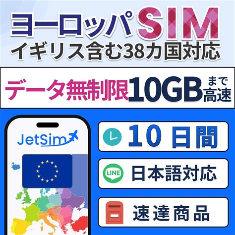 ヨーロッパ 38カ国 SIMカード 10日間 無制限 SIM データ使い放題 10GBまで高速 テザリング可 Jet Sim ジェットシム 海外sim イギリス フランス ドイツ 10日
